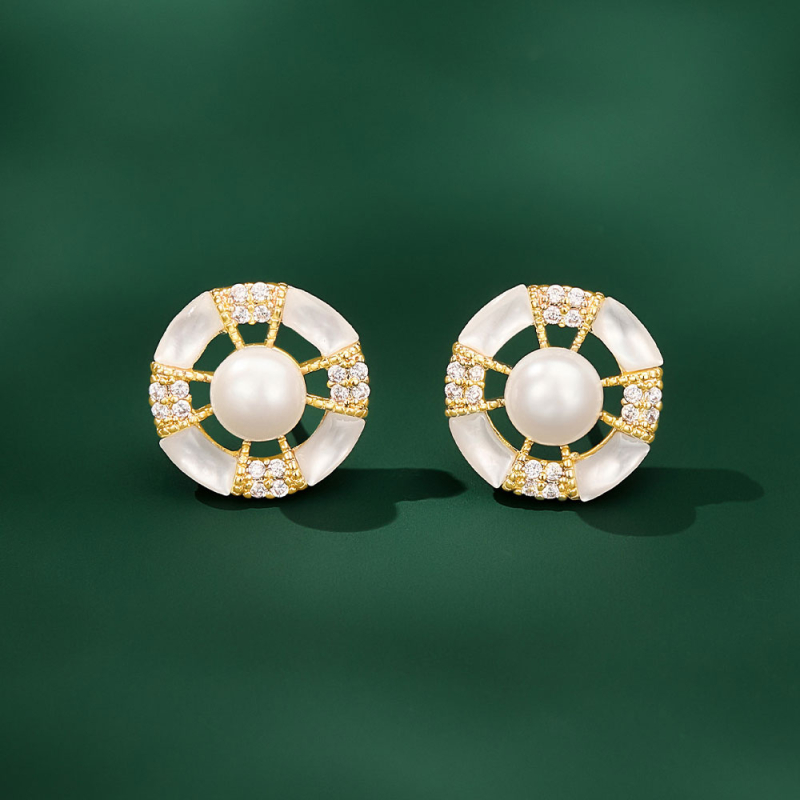 Tyto luxusní náušnice zaujmou na první pohled svou jemnou, dokonale vyváženou kompozicí, která propojuje eleganci, ženskost a nadčasový design. Centrální perla je zasazena do dekorativního rámu tvořeného perletí a třpytivými zirkony, které společně vytvářejí harmonický celek připomínající stylizovaný věnec či ornament. Zlatavý tón podkladu dodává náušnicím hřejivost a luxusní nádech, zatímco jejich tvar působí kultivovaně a vkusně.Spojení perly, perleti a zirkonů působí velmi sofistikovaně a jemně. Perla v centru symbolizuje čistotu a přirozenou krásu, zatímco perleť dodává šperku měkký lesk a decentní světelné odlesky. Zirkony pak přinášejí jiskru, která náušnice oživuje a činí z nich výrazný, avšak stále elegantní doplněk. Celek působí vyváženě, svěže a velmi ženským dojmem.Díky svému kompaktnímu tvaru jsou náušnice ideální jak pro každodenní nošení, tak i pro slavnostní příležitosti. Skvěle doplní minimalistický outfit i elegantní večerní styl. Jsou perfektní volbou pro ženu, která hledá šperk s jemným luxusem, který nepůsobí okázale, ale přesto zaujme svou propracovaností a harmonií detailů. 💡 Tip: Perla je symbolem elegance a ženskosti, proto jsou tyto náušnice krásným dárkem k narozeninám, výročí nebo jako poděkování.