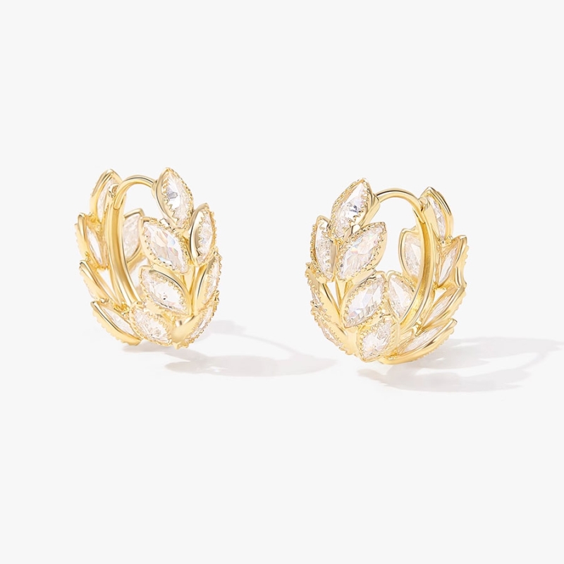 Náušnice s motivem klásků zlatého obilí v sobě nesou jemnost přírody i symboliku hojnosti a prosperity. Jejich design je pečlivě propracovaný – každé „zrno“ je tvořeno třpytivým čirým zirkonem broušeným do tvaru lístku, zasazeným do zlaté obroučky. Celek působí jako elegantní věneček, který se půvabně vine kolem ušního lalůčku.Zlatý povrch náušnic nádherně kontrastuje s chladivým leskem čirých zirkonů, čímž vytváří dojem světelné hry při každém pohybu. Náušnice se zapínají komfortně a bezpečně, jsou vhodné pro každodenní nošení i slavnostní příležitosti. Jejich kompaktní tvar a strukturovaný vzhled dodávají celkovému outfitu jemnost i noblesu.Tento šperk zaujme ženy s vytříbeným vkusem, které oceňují spojení přírodních motivů s moderním zpracováním. Náušnice krásně vyniknou jak ve spojení s rozpuštěnými vlasy, tak při elegantním účesu – stanou se decentním, ale výjimečným doplňkem. 💡 Tip: Zkombinujte tyto náušnice s jemným náhrdelníkem nebo zlatým náramkem ve stylu „boho elegance“. Perfektně se hodí i jako šperk ke slavnostním šatům v krémových, zelených nebo zlatavých tónech – vytvoří harmonický celek plný přírodní poezie.