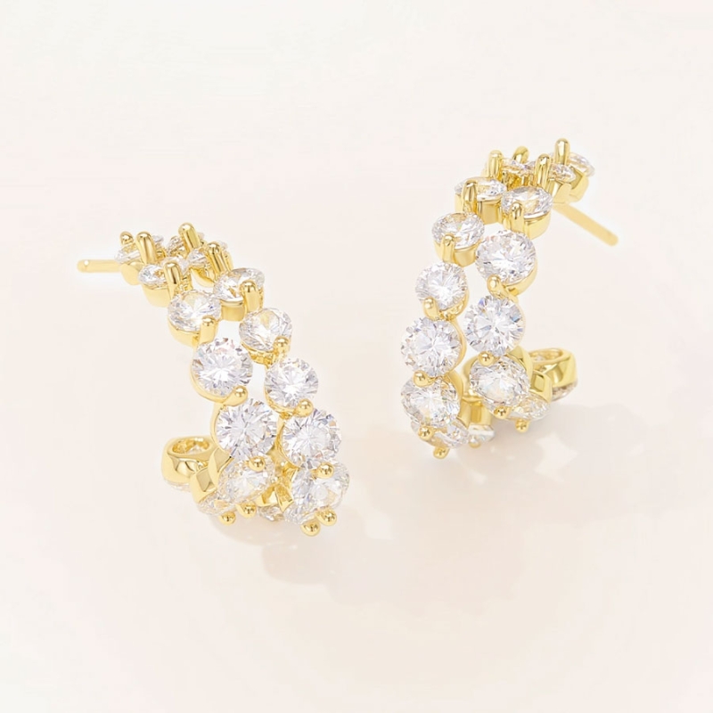 Tyto působivé náušnice v pozlaceném provedení spojují klasickou krásu s moderním designem. Dvě linie zářivých čirých zirkonů vytvářejí elegantní oblouk, který jemně obepíná ušní lalůček a zajišťuje sofistikovaný lesk z každého úhlu. Jejich design zaujme na první pohled, ale zároveň si zachovává subtilní eleganci.Pozlacený základ dodává šperku hřejivý tón, který výborně kontrastuje s chladivým třpytem zirkonů. Díky této kombinaci působí náušnice luxusním dojmem a snadno se kombinují s dalšími zlatými či stříbrnými doplňky. Vhodné jsou jak pro běžné nošení, tak i pro slavnostní příležitosti.Tyto náušnice se zirkony se stanou oblíbeným kouskem každé ženy, která ocení eleganci a jemnost v jednom. Skvěle doplní romantický outfit, ale neztratí se ani při večerním setkání či na svatbě – ať už jako host, nebo svědkyně. 💡 Tip: Náušnice krásně vyniknou s vlasy vyčesanými nahoru nebo s elegantním drdolem. Jsou ideální volbou pro koktejlové šaty, slavnostní večerní outfit nebo jako doplněk k jednoduché bílé halence, která nechá jejich třpyt plně zazářit. Díky své univerzálnosti se snadno kombinují s dalšími doplňky.