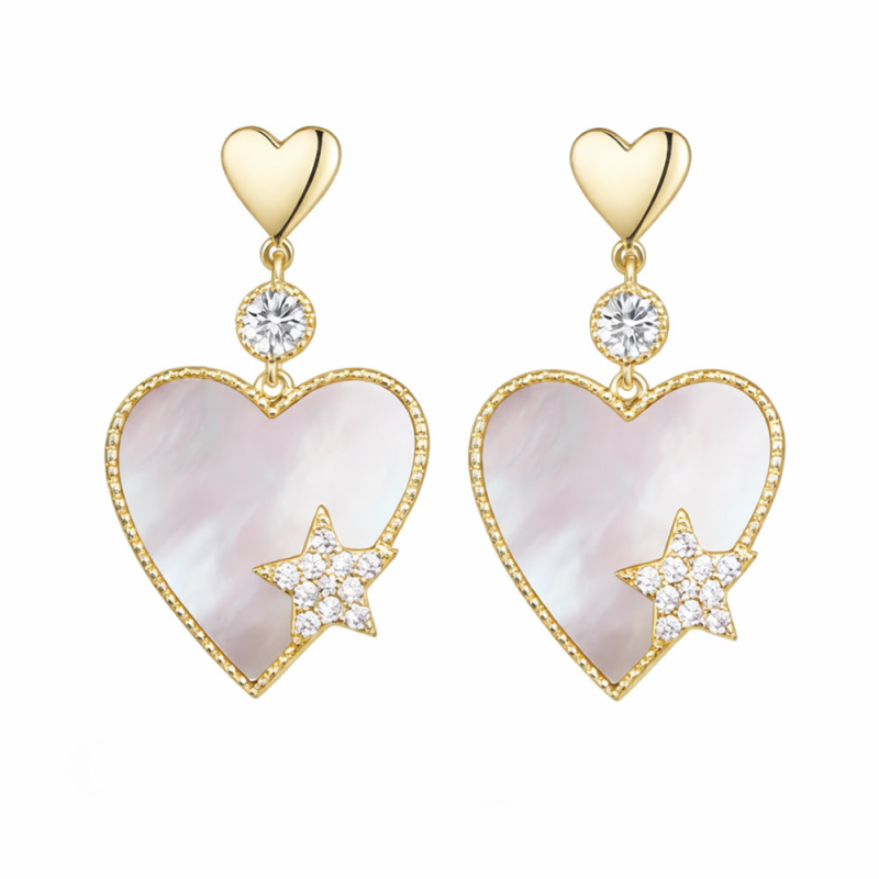Něžnost perleti, jemný třpyt zirkonů a romantický motiv srdce – tyto luxusní náušnice působí jako drobný šperk s velkou emocí. Zlatý tón jim dodává hřejivost, perleťová výplň lehkost a světelnou hloubku a hvězda osazená zirkony vnese do celku hravý, snový detail. Výsledkem je šperk, který nepůsobí okázale, ale velmi půvabně a ženským dojmem.Každý prvek zde má své místo. Malé srdce u ucha vytváří jemný základ, kulatý čirý kamínek přidává jiskru a hlavní závěsný motiv v podobě perleťového srdce se zirkonovou hvězdou dodává náušnicím nezaměnitelný charakter. Celek připomíná romantický šperk s moderním pojetím, který se krásně hodí pro ženy, jež mají rády něhu, světlo a elegantní detaily.Tyto náušnice jsou ideální pro chvíle, kdy chcete působit jemně, upraveně a s lehkým romantickým akcentem. Nádherně doplní slavnostní šaty, saténovou halenku i jednoduchý outfit, kterému dodají měkkost a šarm. Jsou jako stvořené pro ženy, které milují šperky s citlivým designem a jemnou symbolikou. 💡 Tip: Tyto náušnice si skvěle rozumí s jemnými materiály, jako je satén, viskóza, hedvábí nebo lehký úplet. Výborně doplní šaty v pudrových, smetanových, béžových i světle růžových tónech a podtrhnou ženský, něžný styl.