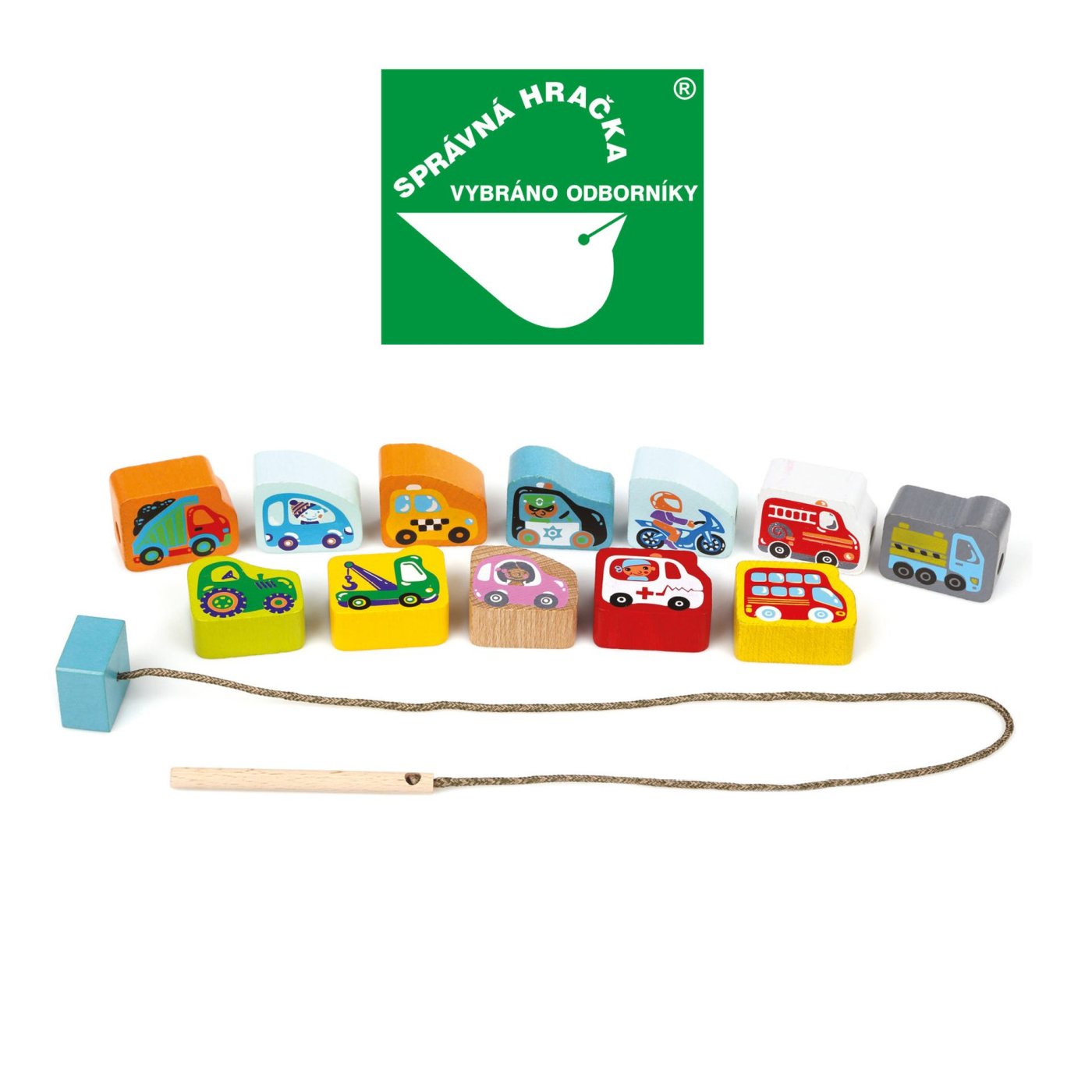 CUBIKA je nová značka dřevěných hraček vyrobených pouze z ekologicky pěstovaného dřeva s velmi precizním opracováním a líbivým designem. Navlékací dopravní prostředky jsou ideální hrou pro procvičení jemné motoriky, trpělivosti a paměti. Sada nabízí 12 dřevěných navlékacích prvků s dopravní tematikou, jednu tkaničku s dřevěným kolíčkem na prostrkování na jedné straně a zarážkou na druhé straně a 8 předloh s různě seřazenými tematickými prvky, podle kterých děti jednotlivé dílky navlékají. Zdatnější hráči si pak mohou předlohu jen prohlédnout a zkusit navlékat zpaměti a vytvářet si tak svůj vlatní příběh. Sortiment hraček značky CUBIKA pomáhá dětem rozvíjet především senzomotorické schopnosti a dovednosti, logické myšlení, kreativitu, představivost a různé poznávací znalosti. Hračky jsou vyrobeny z nejkvalitnějšího javoru a buku a k barvení se používají též vysoce kvalitní barvy na vodní bázi, které jsou naprosto bezpečné pro děti a nemají žádný zápach. Všechny výrobky této značky mají německý certifikát TÜV a jsou vyrobeny dle evropské normy pro bezpečnost hraček EN 71. Nevhodné pro děti do 3 let. Vyrobeno v Evropě. Produkt získal ocenění Správná hračka - vybráno odborníky. Ocenění uděluje odborná porota z Asociace předškolní výchovy.
