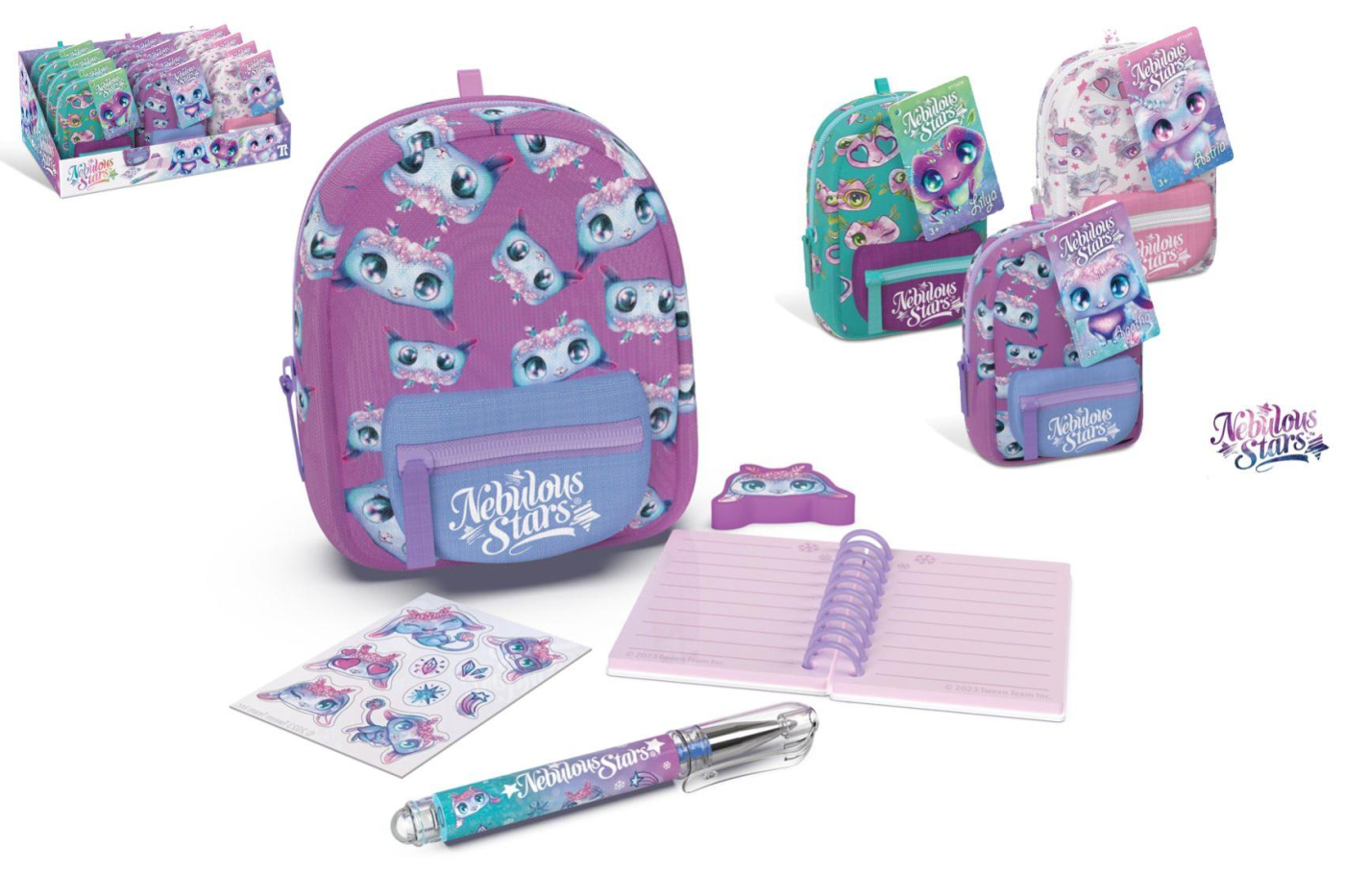 Nebulous Stars Mini batůžek set. Rozměry 9x6x11 cm. Obsah - batůžek, přívěšek, linkovaný notes, propiska, guma, nálepky. 12 ks display box. 3 varianty - modrá, bílá, fialová.