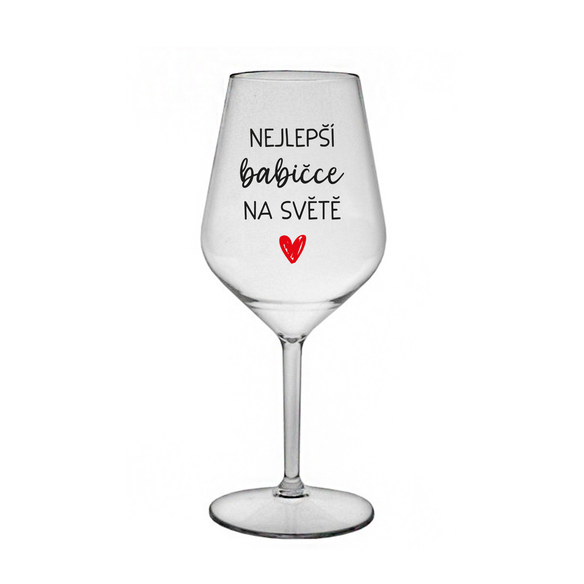 Nerozbitná čirá vinná sklenice s motivem NEJLEPŠÍ BABIČKA NA SVĚTĚ je skvělá na zahradu, pláž, výlet, piknik a parádu udělá i při kempování. Jelikož je vyrobená z kvalitního polykarbonátu je de facto nerozbitná. Je to luxusní kousek, s nímž si víno můžete vychutnat prostě kdekoliv. Mají ergonomický tvar, který příjemně padne do ruky a protože je lehká, usnadňuje to její přenášení. Je snadno skladovatelná a lehce se čistí. Díky svému designu si s ní můžete vychutnat doopravdy kdekoliv bezproblémové pití výborného vína. Materiál PP. Vyrobené s láskou v ČR