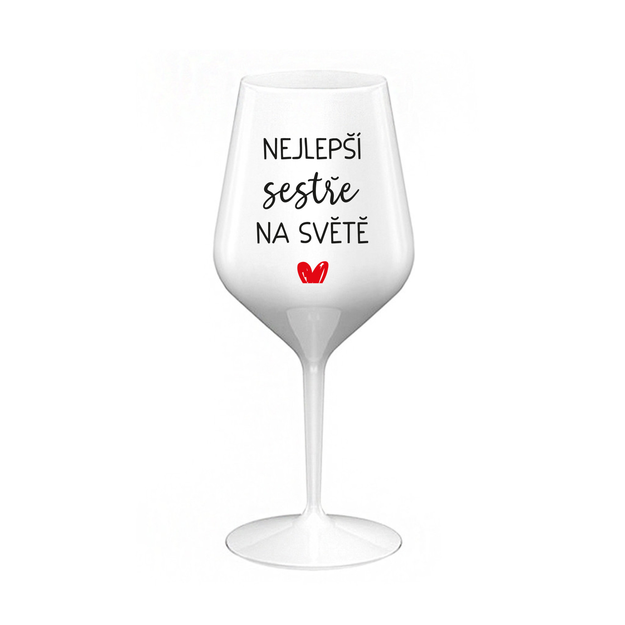 Nerozbitná bílá vinná sklenice s motivem NEJLEPŠÍ SESTŘE NA SVĚTĚ je skvělá na zahradu, pláž, výlet, piknik a parádu udělá i při kempování. Jelikož je vyrobená z kvalitního polykarbonátu je de facto nerozbitná. Je to luxusní kousek, s nímž si víno můžete vychutnat prostě kdekoliv. Mají ergonomický tvar, který příjemně padne do ruky a protože je lehká, usnadňuje to její přenášení. Je snadno skladovatelná a lehce se čistí. Díky svému designu si s ní můžete vychutnat doopravdy kdekoliv bezproblémové pití výborného vína. Materiál PP. Vyrobené s láskou v ČR