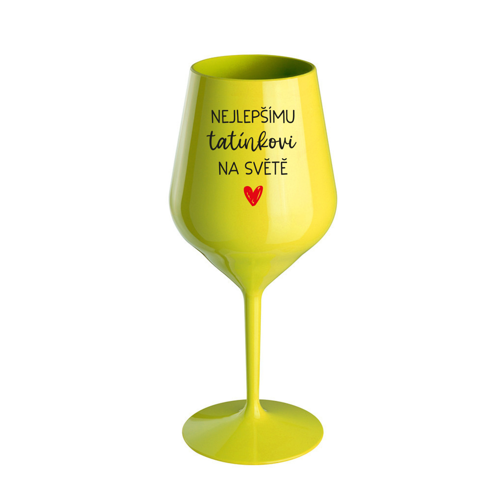 Nerozbitná žlutá vinná sklenice s motivem NEJLEPŠÍMU TATÍNKOVI NA SVĚTĚ je skvělá na zahradu, pláž, výlet, piknik a parádu udělá i při kempování. Jelikož je vyrobená z kvalitního polykarbonátu je de facto nerozbitná. Je to luxusní kousek, s nímž si víno můžete vychutnat prostě kdekoliv. Mají ergonomický tvar, který příjemně padne do ruky a protože je lehká, usnadňuje to její přenášení. Je snadno skladovatelná a lehce se čistí. Díky svému designu si s ní můžete vychutnat doopravdy kdekoliv bezproblémové pití výborného vína. Materiál PP. Vyrobené s láskou v ČR