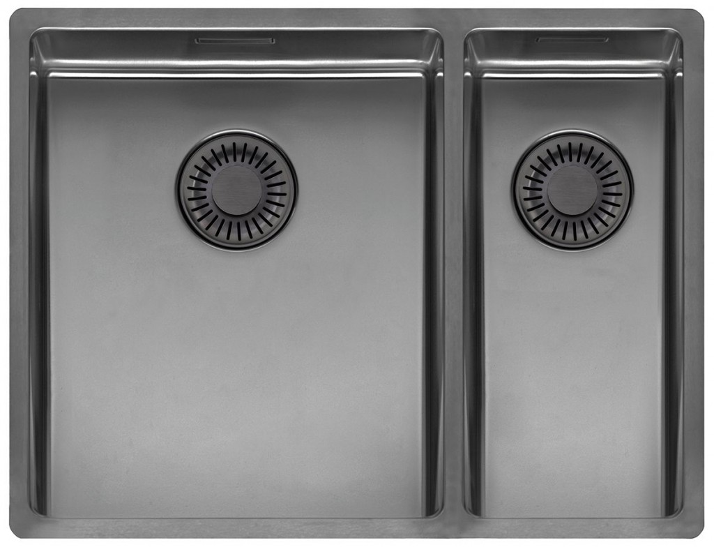 Nerezový dřez 4x40+18x40 cm, povrch Gun Metal, montáž horní / do roviny / spodní Materiál: Nerezová ocel 304 Tloušťka materiálu: 0,9 mm Povrchová úprava: PVD Gun Metal Montáž: horní / do roviny / spodní Při spodní montáži nutno doobjednat úchytky R18996 Obsahuje odpadovou sadu bez excentru (ruční ovládání výpusti) Sifon není součástí dodávky (možno doobjednat pod označením R18934) Vnitřní rozměry levé vaničky (ŠxHxV): 343 x 403 x 180 mm Vnitřní rozměry pravé vaničky (ŠxHxV): 183 x 403 x 145 mm Celkové rozměry dřezu (ŠxHxV): 580 x 440 x 180 mm Rádius: 10 mm Minimální šířka skříňky: 600 mm