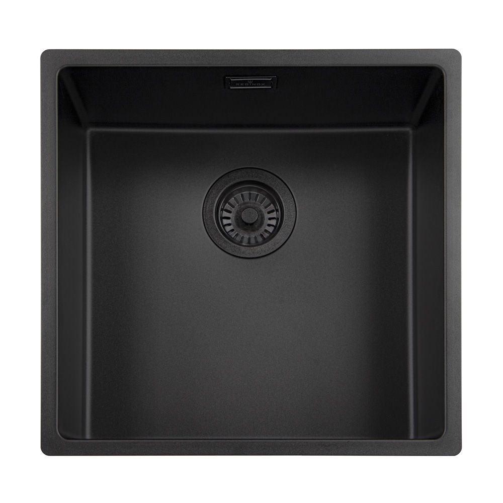 Nerezový dřez 40x40 cm, černý povrch Jet Black, montáž horní / do roviny / spodní Materiál: Nerezová ocel 304 Tloušťka materiálu: 0,9 mm Povrchová úprava: černá Jet Black Montáž: horní / do roviny / spodní Při spodní montáži nutno doobjednat úchytky R18996 Obsahuje odpadovou sadu bez excentru (ruční ovládání výpusti) Sifon není součástí dodávky (možno doobjednat pod označením R18934) Vnitřní rozměry vaničky (ŠxHxV): 403 x 403 x 180 mm Celkové rozměry dřezu (ŠxHxV): 440 x 440 x 180 mm Rádius: 10 mm Minimální šířka skříňky: 500 mm