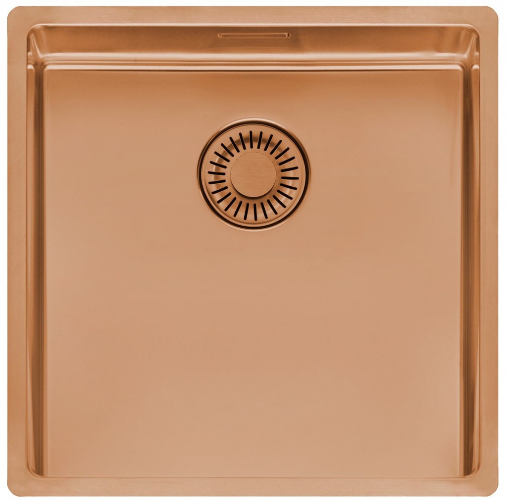 Nerezový dřez 40x40 cm, povrch Copper / měď, montáž horní / do roviny / spodní Materiál: Nerezová ocel 304 Tloušťka materiálu: 0,9 mm Povrchová úprava: PVD Copper / měď Montáž: horní / do roviny / spodní Při spodní montáži nutno doobjednat úchytky R18996 Odpadové sítko Comfort pro lepší vzhled a jednodušší čištění Obsahuje odpadovou sadu bez excentru (ruční ovládání výpusti) Sifon není součástí dodávky (možno doobjednat pod označením R18934) Vnitřní rozměry vaničky (ŠxHxV): 403 x 403 x 180 mm Celkové rozměry dřezu (ŠxHxV): 440 x 440 x 180 mm Rádius: 10 mm Minimální šířka skříňky: 500 mm