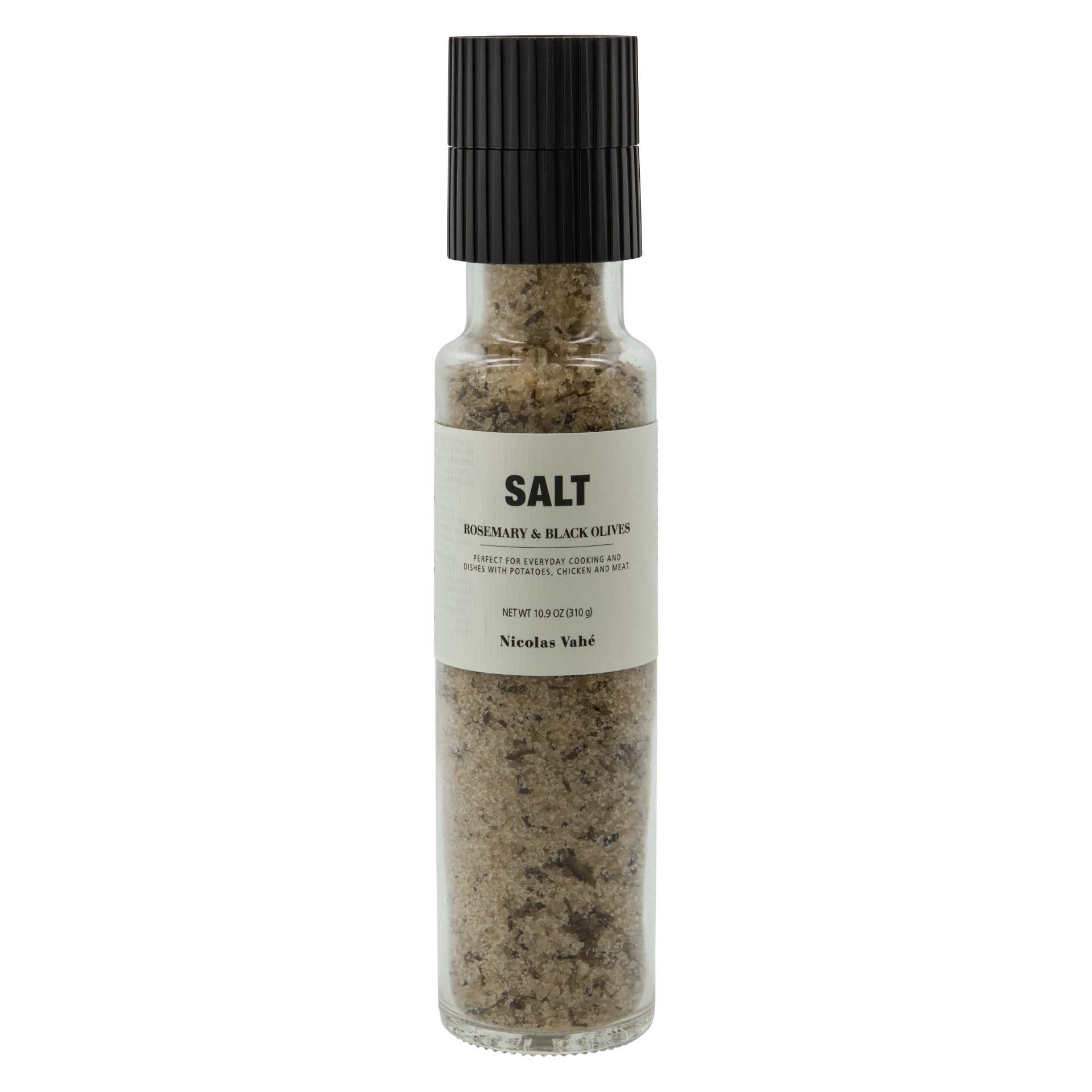 Složení: mořská sůl (protihrudkující látka E535), rozmarýn 2 %, sušené černé olivy 1,3 %, aroma, voda, potravinářské barvivo: E150b.