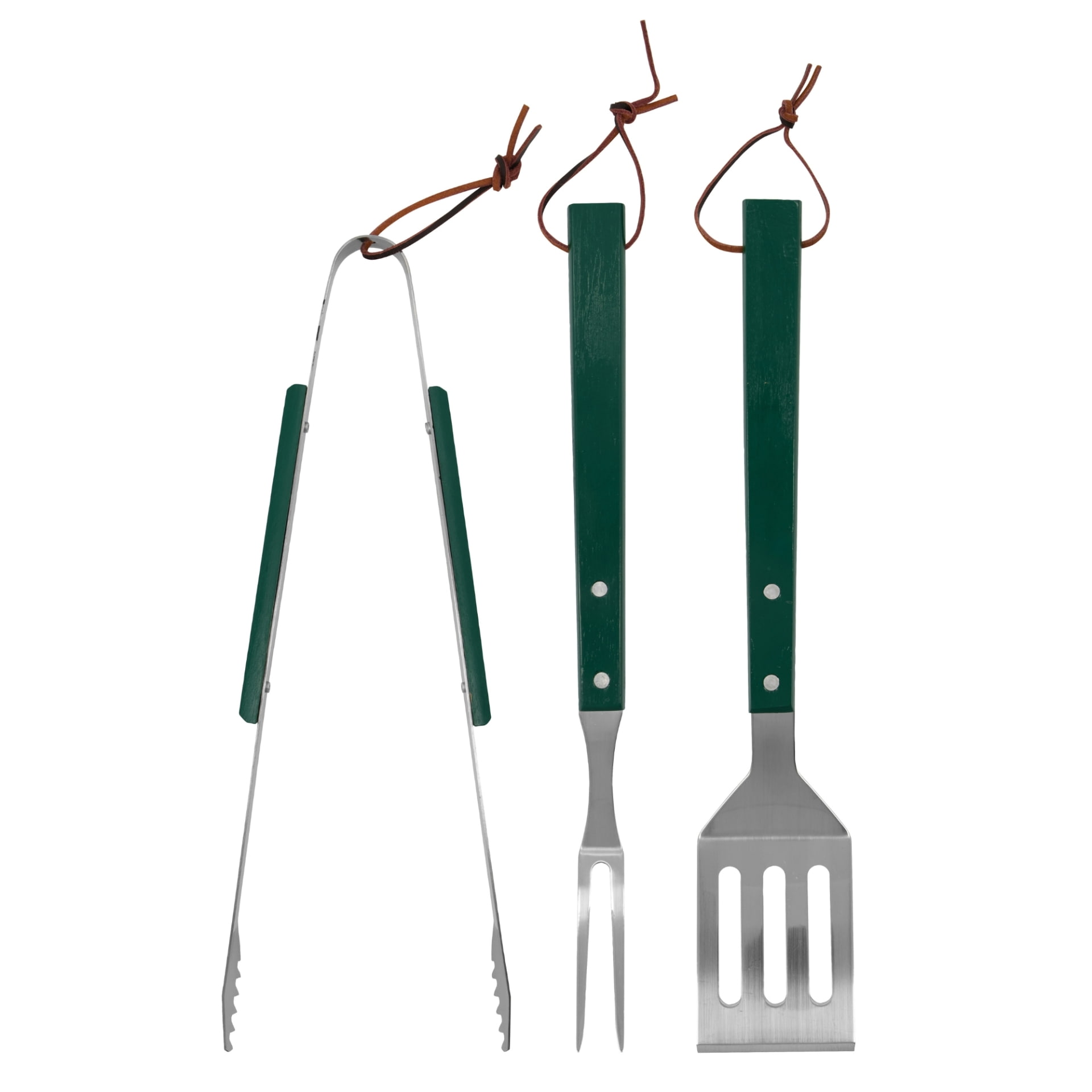 Nicolas Vahé Nerezová grilovací sada BBQ Green, zelená barva, dřevo, kov. Sada grilovacího náčiní BBQ od Nicolas Vahé obsahuje tři nástroje z odolné nerezové oceli s rukojeťmi z akáciového dřeva. Díky kombinaci kvalitních materiálů je grilovací náčiní pevné, dobře se drží a je velmi odolné. Kožená poutka umožňují pohodlné zavěšení u grilu nebo v kuchyni.
