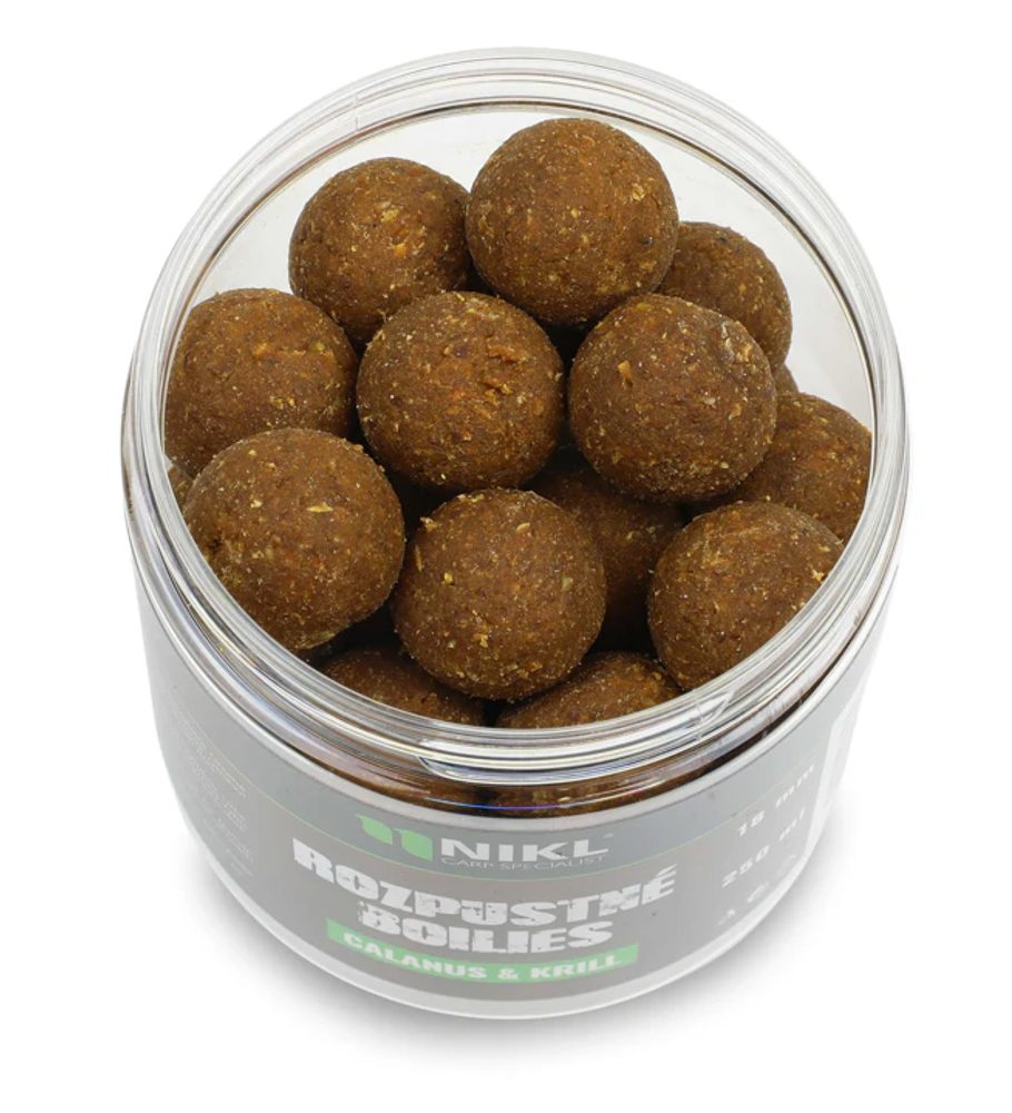 Super nástraha, která pomáhá docílit záběru v co nejkratším čase, takže je perfektní pro krátkodobé nebo závodní chytání. Nikl Rozpustné boilies Calanus & Krill je rychle pracující nástraha s korýším profilem postaveným na kombinaci drobných korýšů a krillu, která vytváří výraznou, ale přirozeně působící potravní stopu vhodnou i na prochytávané revíry. Díky upravenému složení s vyšším podílem tekutých a práškových složek se atraktory začínají uvolňovat bezprostředně po dopadu do vody a kolem nástrahy vzniká intenzivní pachová stopa. Rozpustnost zajišťuje rychlý nástup účinku, což je vhodné zejména při krátkých vycházkách nebo závodním lovu, kdy je cílem dosáhnout záběru v co nejkratším čase. Korýší chuť a aroma podporují čitelnost nástrahy ve vodě a pomáhají udržet zájem ryb v okolí montáže i při nižší aktivitě.