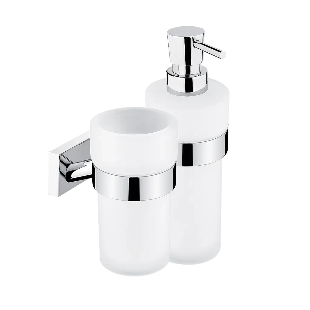 Nimco Keira chrom držák dávkovače a sklenky KE 2205831W-T-26 Držák dávkovače a sklenky. Nádobky z matovaného skla. Objem dávkovače 250 ml. Pumpička mosaz/chrom. Ke koupelně neodmyslitelně patří nejen drobnosti a pomůcky k mytí a čištění těla, ale také nejrůznější koupelnové doplňky. Ideální je, když v těchto věcech máme možnost výběru. Vaší inspirací může být právě moderní série KEIRA s ostrými hranami. Výrobek je určený k vrtání i k nalepení. Montážní plíšek je pro obě varianty stejný. Lepidlo MAMUT není součástí balení výrobku. Lze jej dokoupit pod artiklovým číslem 35003TU. Množství lepidla v tubě vystačí k přilepení 8-10 úchytů.