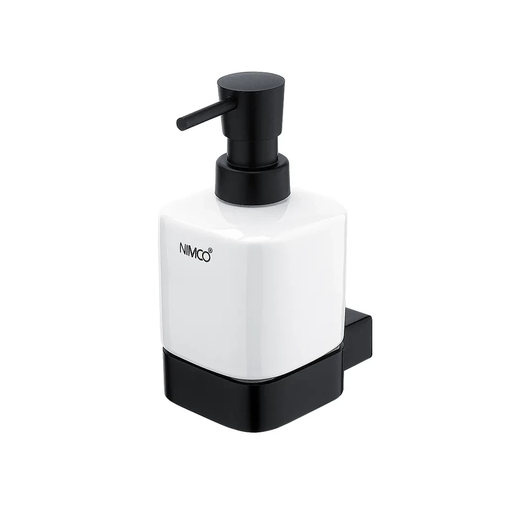 Nimco Kibo černá mat dávkovač tekutého mýdla pumpička mosaz Ki-14031K-T-90 Dávkovač na tekuté mýdlo. Nádobka keramická. Úchyt mosaz / černý mat. Objem dávkovače 320 ml. Minimalismus, elegance, nadčasovost? To vše může představovat černá v interiérech. Černá by neměla koupelně vládnout, nicméně v kombinaci s bílou vytvoří unikátní prostor, který se neokouká. Stále váháte použít černou? Začněte s doplňky KIBO. K čištění povrchu se používá hadřík z mikrovlákna namočený v mýdlové vodě nebo octovém roztoku. Po umytí se vysuší povrch jemným hadříkem. Použití bělících, dezinfekčních, alkalických, silně koncentrovaných čistících prostředků obsahující silná činidla nebo použití tekutých písků by mohlo povrch poškodit!