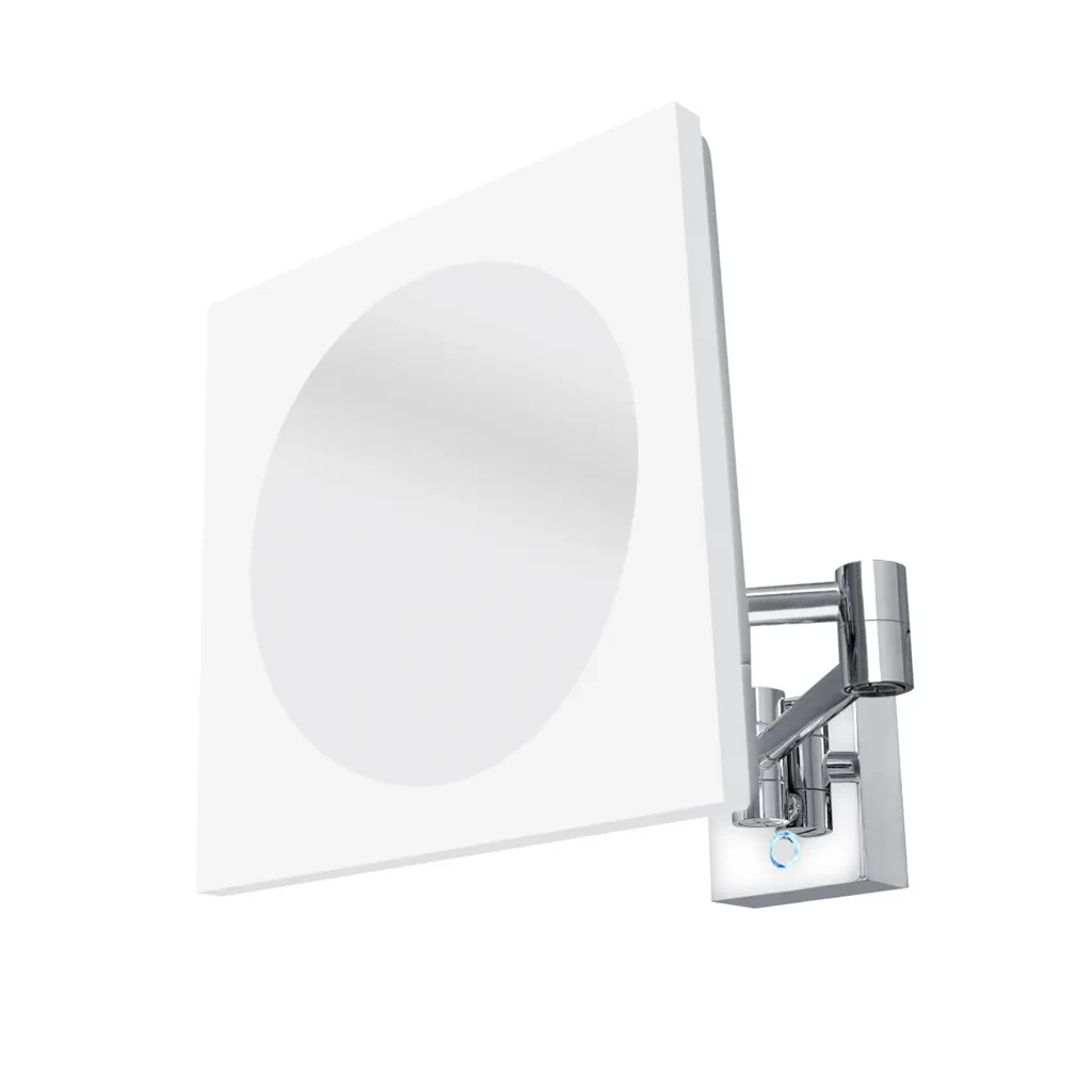 Nimco Model 20400 chrom mat kosmetické zrcátko s LED podsvícením ZK 20465-26 LED zvětšovací zrcátko s dotykovým podsvíceným senzorem. Teplota chromatičnosti 6500 K. Výkon 8 W. Vaše péče o pleť a dokonalé nalíčení bude pohodlnější a příjemnější s LED kosmetickým zrcátkem NIMCO, podsvíceným po obvodu- PLEXIGLASS. Jeho pětinásobné zvětšení vám pomůže k dokonalosti. Použité LED čipy o vysokém výkonu. Barevná teplota zvolena studená bílá. Teplota chromatičnosti 6500K. Dotykový podsvícený spínač. Připojení 220-240V. Ochrana IP 21. Výkon 8W. LED zrcátko s vypínačem, zapojení ploché vidlice do zásuvky. Délka kabelu bez natažení 56 cm, po vytažení 120 cm. Hloubka zrcadla ve složeném stavu u zdi je 9 cm. Celková šířka zrcadla ve složeném stavu u zdi je 23 cm.