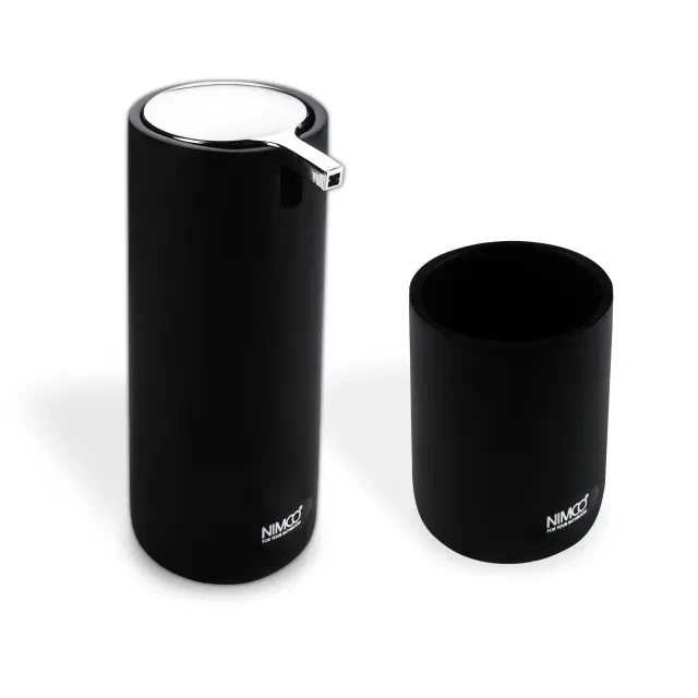 Nimco Omi černá mat dávkovač na tekuté mýdlo s pohárkem OM 1605831-90 Set s dávkovačem na mýdlo a pohárkem na kartáčky. Objem 175 ml. Barva černá. Materiál polyresin. Černá a bílá barva se svou mírou vytříbeného vkusu a smyslné elegance těžko nacházejí obdobu. Černá je barvou, která pohlcuje světlo a zároveň je zcela kontrastní. Je to barva do jisté míry absolutní. Jediná barva, která se jí takříkajíc může postavit je barva z opačného konce barevného spektra a tou je barva bílá. Tyto dva vzdálené a silné kontrasty pak dokáží vytvářet onu obdivuhodnou a stokrát napodobovanou dávku naprosté elegance.