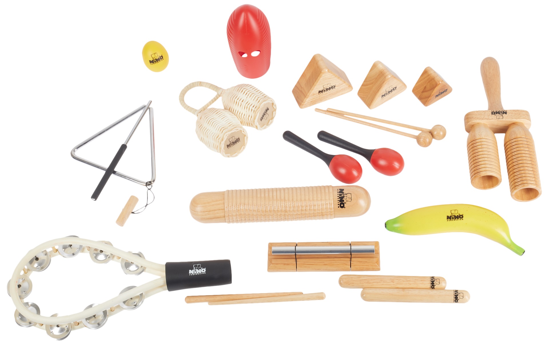 Perkusní sada Tento velký set perkusí obsahuje 15 různých nástrojů. Jde tak o ideální soupravu pro celou třídu či větší skupiny. Souprava zahrnuje: , Dřevěné drhlo , Šestipalcový triangl , Plastové maracas se shakerem tvaru vajíčka , Mini drhlo , Shaker vajíčko , Tamburínu , Pár dřevěných claves (tyčky) , Chimes včetně paličky , Wood A-Go-Go s paličkou , Dvojitý shaker , 3 ks. dřevěných shakerů , Shaker banán , Dřevěný box