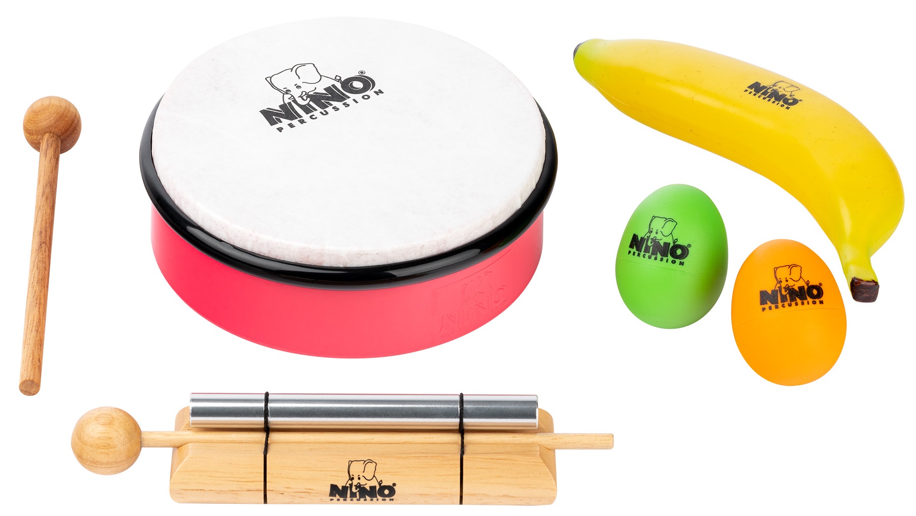 Perkusní sada Perkusní sada Mixed Rhythm Set NINOSET8 značky Nino Percussion obsahuje dva egg shakery, banana shaker, dětský bubínek s paličkou a energy chime s paličkou.