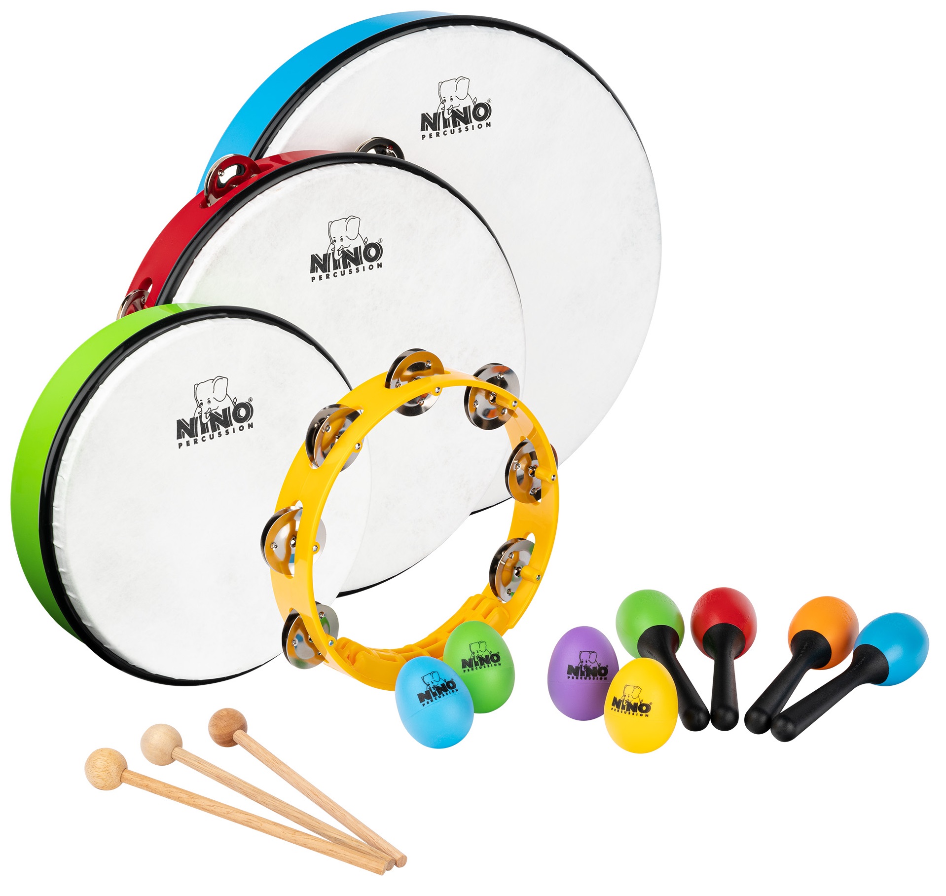 Perkusní sada Perkusní sada Mixed Rhythm Set NINOSET9 značky Nino Percussion obsahuje čtyři egg shakery, čtyři různobarevné maracas/rumba koule, dva dětské bubínky, dvě tamburíny a tři paličky.