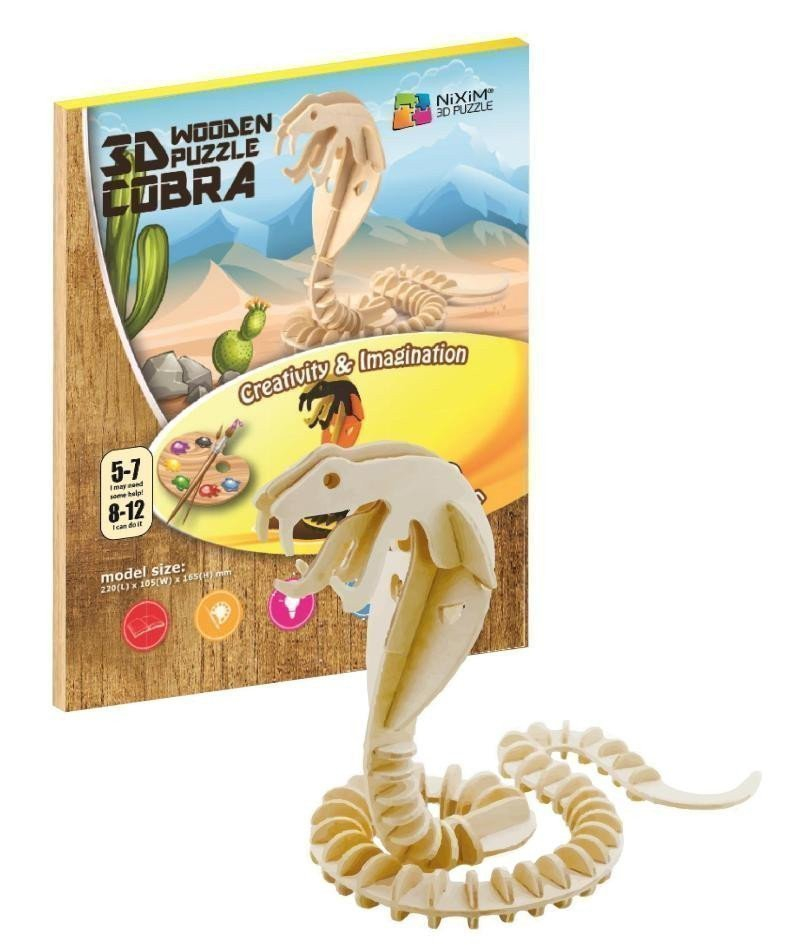 Dřevěné 3D puzzle. Sestav si dřevěný model kobry za pomoci obrázkového návodu. V balení se nacházejí 2 dřevěná prkna s předřezanými díly, které jednoduchým způsobem do sebe zapadají. Rozměry poskládaného modelu jsou 220x104x165 mm. Doporučený věk od 5 let nebo 7 let podle dovednosti.