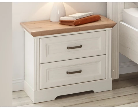 Noční stolek se 2 zásuvkami v provedení bělená pinie s dubovým dřevodekorem z kolekce Jasmin - nábytek v moderním venkovském stylu s důrazem na detail navazuje na tradici útulně zařízeného domova a přímo láká k tomu, abyste si vytvořili prostředí, kde se budete cítit dobře. Kombinujte tak jednotlivé elementy z této řady a vytvořte si stylový rustikální interier s nádechem tradice.