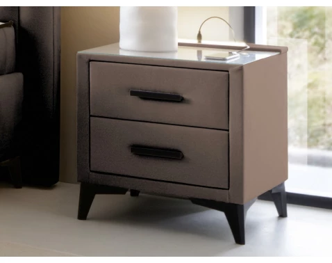 Noční stolek se 2 zásuvkami je očalouněn sametově hebkou látkou v odstínu hnědá, která má zajímavý lesklý efekt a zároveň je i velmi odolná. Luxusní dojem nočního stolku umocňuje čiré bezpečnostní sklo v horní části, díky němuž je údržba horní plochy snazší. Zvýšená konstrukce na černých nožkách vám umožní umístit stolek k vyššímu lůžku a zároveň usnadní udržbu podlahy. Tento luxusní stolek obsahuje navíc 2 praktické USB výstupy pro napojení smart příslušenství a také zabudovanou lištu s LED osvětlením, které poslouží jako lampička anebo doplněk pro vytvoření příjemné nasvícené večerní atmosféry.