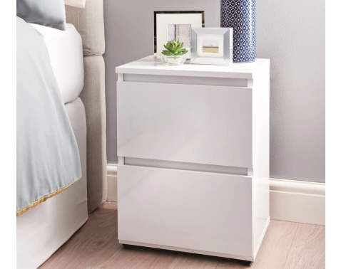 Leskle bílý noční stolek se 2 šuplíky se vejde se i do malého prostoru ložnice. Svým nadčasovým minimalistickým designem pasuje do každého moderního bytu.