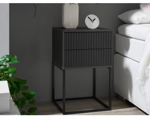 Noční stolek na černé kovové podnoži a v tmavě šedé grafitové barvě má na předních plochách zajímavý lamelový efekt. Pasuje i do menší ložnice anebo jinam.