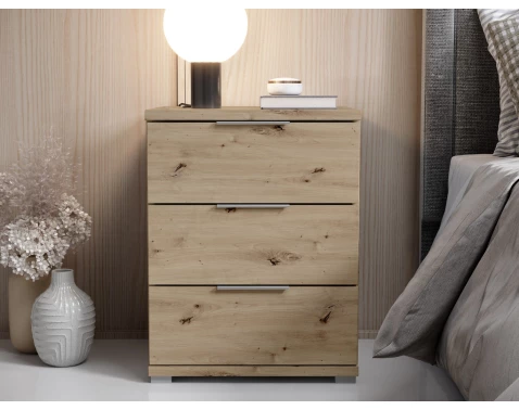 Noční stolek se 3 zásuvkami v moderním minimalistickém stylu působí nadčasově. Tento stolek k posteli má celkovou výšku 61 cm a je vyroben v dekoru dub artisan.