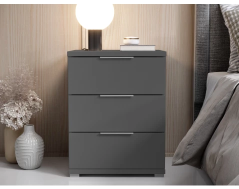 Noční stolek se 3 zásuvkami v moderním minimalistickém stylu působí nadčasově. Tento stolek k posteli má celkovou výšku 61 cm a je vyroben v grafitové barvě.