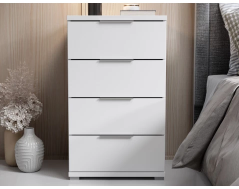 Vysoký noční stolek/skříňka se 4 zásuvkami v moderním minimalistickém stylu působí nadčasově. Má celkovou výšku 79 cm a je vyroben v bílé barvě.