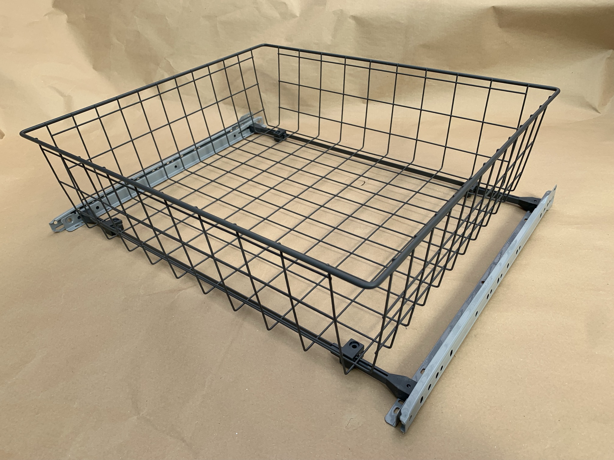 - drátěný výsuvný šatní koš- materiál kov- částěčný kolečkový výsuv součástí- barva antracit- štelovatelná šířka v rozmezí 60mm- nosnost 25kg