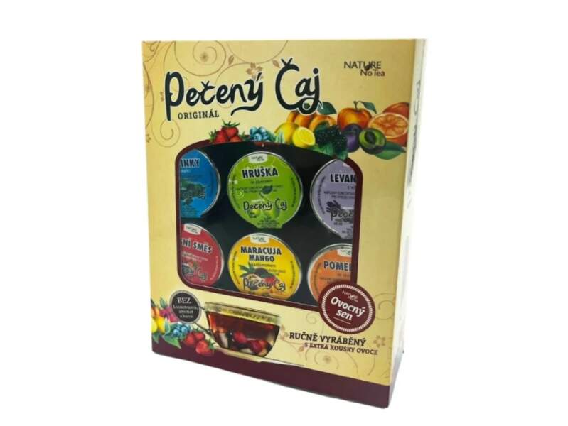 Dárkové balení pečených čajů V balení najdete 12ks jednoporcových balení ve skle 12 × 60ml Dárkový set obsahuje tyto druhy:Bezinka se skořicí, Hruška se zázvorem, Jablko se skořicí, Jahoda se skořicí, Lesní směs, Levandule s višní, Malina se skořicí, Maracuja mango s kardamomem, Pomeranč se skořicí, Rakytník s kardamomem, Švestka s badyánem, Zázvor.Pokud by některé druhy pečených čajů nebyly právě k dispozici, nahradíme je jinými dle aktuální nabídky. Varianta teplá - v zimním období stačí obsah skleničky s ovocem jednoduše přelít horkou vodou a vychutnáte si prvotřídní ovocný čaj s opravdu velkými kousky ovoce, který v zimě báječně zahřeje. Varianta na studeno - v letním období stačí obsah skleničky s ovocem zalít dobře vychlazenou vodou či minerálkou, přidat led a získáte tím velmi osvěžující a originální nápoj pro letní dny se skvělou chutí!