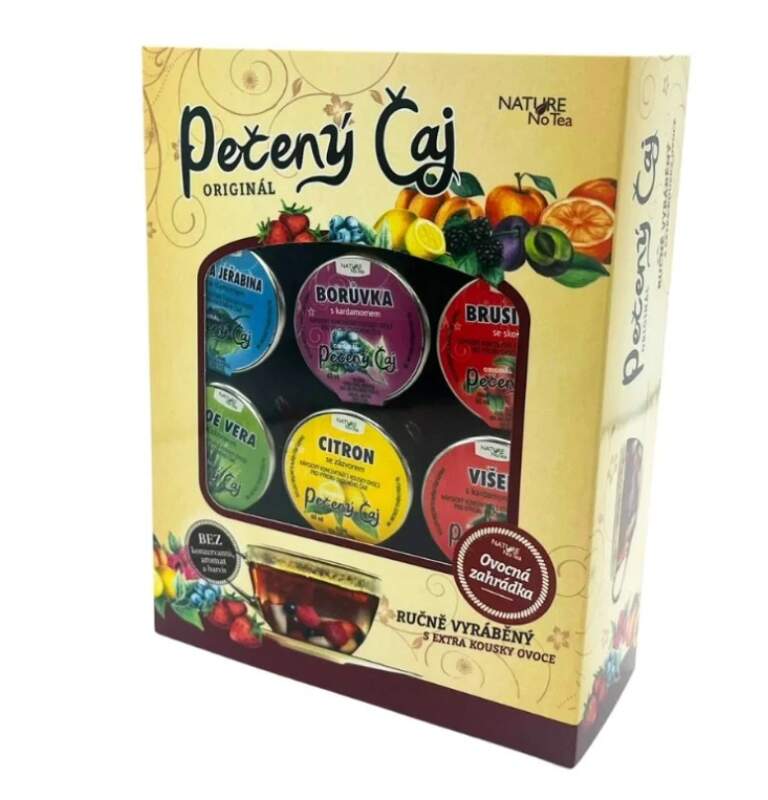 Dárkové balení pečených čajů V balení najdete 12ks jednoporcových balení ve skle 12 × 60ml Dárkový set obsahuje tyto druhy:Aloe vera se zázvorem, Ananas s mátou, Angrešt se skořicí, Borůvka s kardamomem, Brusinka se skořicí, Černá jeřabina s kardamomem, Černý rybíz s kardamomem, Citron se zázvorem, Meruňka se skořicí, Ostružina s kardamomem, Šípek-granátové jablko se zázvorem, Višeň s kardamomem.Pokud by některé druhy pečených čajů nebyly právě k dispozici, nahradíme je jinými dle aktuální nabídky. Varianta teplá - v zimním období stačí obsah skleničky s ovocem jednoduše přelít horkou vodou a vychutnáte si prvotřídní ovocný čaj s opravdu velkými kousky ovoce, který v zimě báječně zahřeje. Varianta na studeno - v letním období stačí obsah skleničky s ovocem zalít dobře vychlazenou vodou či minerálkou, přidat led a získáte tím velmi osvěžující a originální nápoj pro letní dny se skvělou chutí!