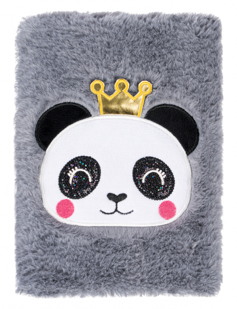 Originální notes s plyšovým povrchem v šedivé barvě s obrázkem pandy. • Linkovaný • 148 vnitřních stran • Plyšové desky.