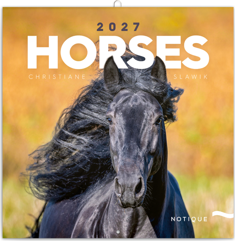 Majestátní krása koní na 12 snímcích známé německé fotografky Christiane Slawik. V kalendáři kromě fotek najdete přehledné kalendárium od září 2026 do prosince 2027 v šesti jazycích, měsíční fáze, důležité svátky a prostor pro poznámky na každý den.