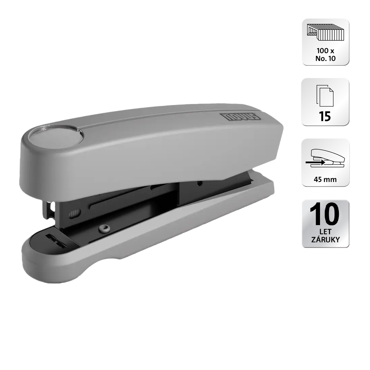 Kompaktní a výkonná sešívačka menší velikosti pro efektivní práci doma nebo v kanceláři. Odolná, celokovová konstrukce s částečným plastovým krytem pro dlouhou životnost a spolehlivý výkon. Snadné příbíjení sponek na vertikální povrch, pevný způsob sešívání. Integrovaný odstraňovač sponek, horní plnění pro snadné a rychlé doplnění. Ergonomický design a moderní barvy.hloubka vkládání: 45 mmkapacita: 15 listů (80 g/m²)barva: šedáhmotnost: 100 gvertikální použití, pevný způsob sešíváníhorní plnění sponek, integrovaný odstraňovač sponekzáruka 10 letobsah balení: 1 ks vč. 100 sponek No. 10 SUPER