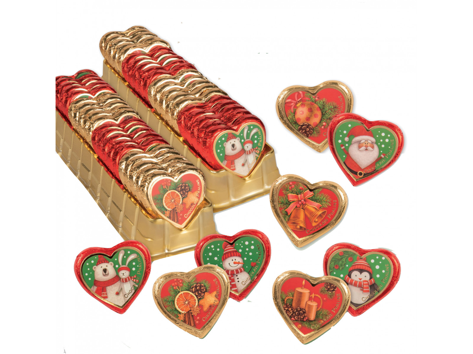 Nugátové srdíčka 24g z jemného lísko-oříškového nugátu s vánočním motivem. Skladem více motivů, posíláme náhodně. složení: Cukr, kakaové máslo, sušené plnotučné mléko, ztužený rostlinný tuk (palmový, shea), lískové oříšky (8,7%), kakaová hmota, laktóza (mléko), sladká sušená syrovátka (mléko), rostlinný olej (slunečnice), nízkotučný kakaový prášek, aroma, emulgátor (sojový lecitin). Obsah kakaové sušiny v mléčné čokoládě nejméně 35% Výživová hodnota na 100 g výrobku: Energetická hodnota 2442 kJ / 587 kcal Tuky 40 g, z toho nasycené mastné kyseliny 23 g Sacharidy 49 g, z toho cukry 47 g Bílkoviny 5,5 g Sůl 0,14 g Vyrobeno v Německu