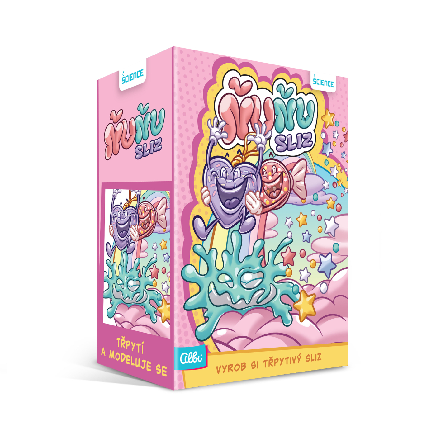 Zábavná experimentální sada z edice Albi Science, se kterou si děti od 6 let vytvoří vlastní sliz kombinací čirého slizu, barevné plastelíny, třpytek, flitrů a kuliček. Sada obsahuje: čirý sliz (60 g) - 3 sáčky, růžovou plastelínu tvrdnoucí na vzduchu (5 g) – 1 sáček, žlutou plastelínu tvrdnoucí na vzduchu (5 g) – 1 sáček, modrou plastelínu tvrdnoucí na vzduchu (5 g) – 1 sáček, přívěsek pro uchování plastelíny – 2 ks, pěnové kuličky (0,5 g) – 1 sáček, hvězdičky (1 g) – 1 sáček, třpytky (1 g) – 1 lahvičku, plastovou karabinu na přívěsek, železné očko na přívěsek – 1 ks a návod.