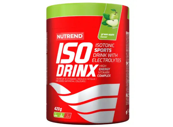 Nutrend Isodrinx je profesionální sportovní nápoj v prášku pro doplnění energie, minerálů a vitamínů s možností jak hypotonického, tak i isotonického ředění. Splňuje fyziologické požadavky organismu na doplňování ztracených tekutin, minerálů a energie při fyzické zátěži. Nutrend Isodrinx obsahuje draslík, hořčík, sodík, z cukrů pak maltodextrin, glukózu, sacharózu. Složení: sacharóza, glukóza, maltodextrin, regulátor kyselosti kyselina citronová, aroma, citronan sodný, stabilizátor karagenan, chlorid sodný, regulátor kyselosti kyselina jablečná, glukonát vápenatý, vitaminový premix (kyselina L-askorbová, DL-α-tokoferylacetát, nikotinamid, D-pantothenát vápenatý, pyridoxin hydrochlorid, riboflavin, thiamin mononitrát, kyselina pteroylmonoglutamová, D-biotin, kyanokobalamin), glukonát draselný, protispékavé látky fosforečnan vápenatý a oxid křemičitý, citronan hořečnatý. Výrobek může obsahovat stopy sóji a mléčné bílkoviny. Nutriční hodnoty na 100 g Energetická hodnota: 1582 kJ / 372 kcal Tuky: 0 g - z toho nasycené mastné kyseliny: 0 g Sacharidy: 90 g - z toho cukry: 83,6 g Vláknina: 0 g Bílkoviny: 0 g Sůl: 1,4 g Vitamin C: 129,2 mg Niacin (Vitamin B3): 25,8 mg Vitamin E: 19,4 mg Kyselina pantothenová (Vitamin B5): 9,7 mg Vitamin B6: 2,3 mg Riboflavin (Vitamin B2): 2,3 mg Thiamin (Vitamin B1): 1,8 mg Vitamin B12: 4,0 µg Biotin: 80,7 µg Kyselina listová: 322,9 µg Nutriční hodnoty na dávku (35 g) Energetická hodnota: 554 kJ / 130 kcal Tuky: 0 g - z toho nasycené mastné kyseliny: 0 g Sacharidy: 31,5 g - z toho cukry: 29,3 g Vláknina: 0 g Bílkoviny: 0 g Sůl: 0,5 g Vitamin C: 45,2 mg Niacin (Vitamin B3): 9,0 mg Vitamin E: 6,8 mg Kyselina pantothenová (Vitamin B5): 3,4 mg Vitamin B6: 0,8 mg Riboflavin (Vitamin B2): 0,8 mg Thiamin (Vitamin B1): 0,6 mg Vitamin B12: 1,4 µg Biotin: 28,3 µg Kyselina listová: 113,0 µg