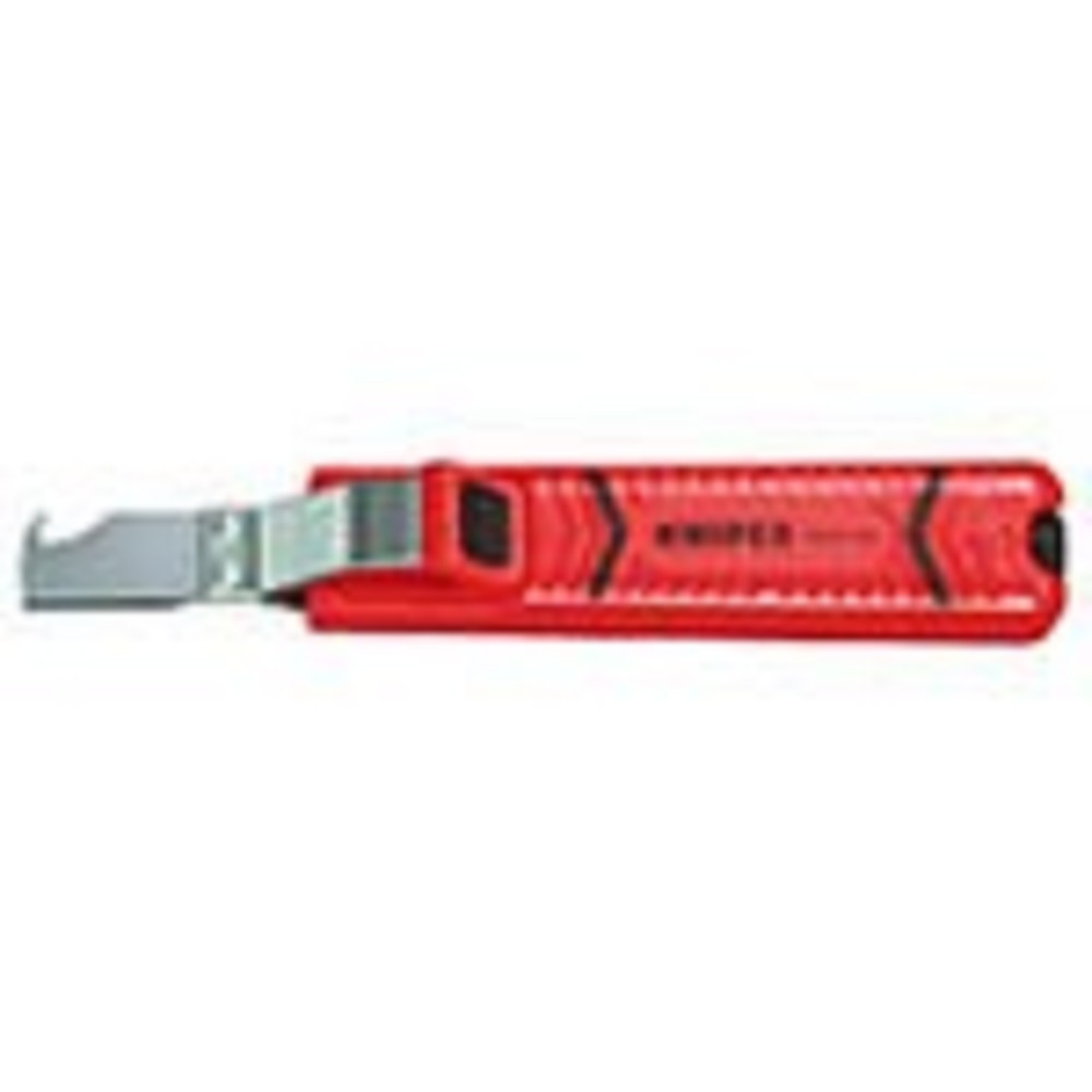 Nůž na kabely 8,0/28,0MM DÉLKA 165MM Knipex KN1620165 Nůž na kabely Knipex KN1620165 je specializovaný nástroj určený pro odstraňování plášťů z kabelů kruhového průřezu. Vlastnosti a použití: Určení: Nůž je určen k odstraňování plášťů ze všech běžných kabelů kruhového průřezu. Umožňuje obvodové i podélné řezy. Rozsah: Pracovní rozsah průměru kabelů je 8,0 až 28,0 mm. Konstrukce: Samoupínací úchyt pro snadnou manipulaci. Nastavení hloubky řezu pomocí nastavovacího šroubu. Samootáčivý nůž pro obvodový a podélný řez. Náhradní čepel je uložena v těle nástroje. Plastové pouzdro odolávající rázovému nárazu. Rozměry: Délka: 165 mm. Použití: Vhodný pro elektrikáře, techniky a další profesionály pracující s kabely. Používá se při instalaci, opravách a údržbě elektrických rozvodů.