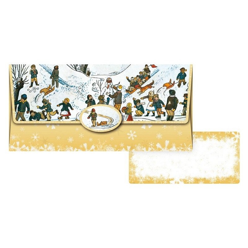 Dárková obálka na peníze s vánočními motivy Josefa Lady a uzavíratelnou klopou. Darujte svým blízkým dárek k Vánocům v podobě obálky na peníze. Do obálky lze vložit peníze nebo dárkový poukaz. Uvnitř je kartička bez textu, na kterou můžete napsat věnování.