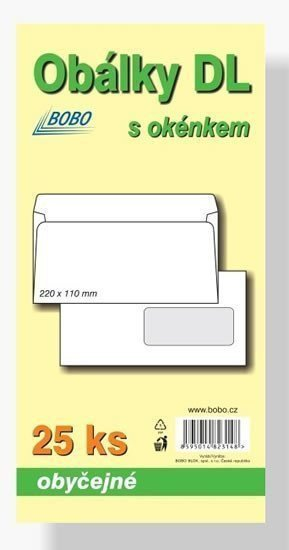 Obálky 220x110 mm, balení 25 ks. Balení klasických poštovních obálek ve formátu DL. Balíček obsahuje 25 kusů obyčejných obálek s okénkem.