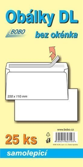 Obálky 20x110 mm, balení 25 ks. Balení klasických poštovních obálek ve formátu DL. Balíček obsahuje 25 kusů samolepicích obálek bez okénka.