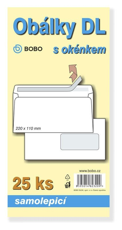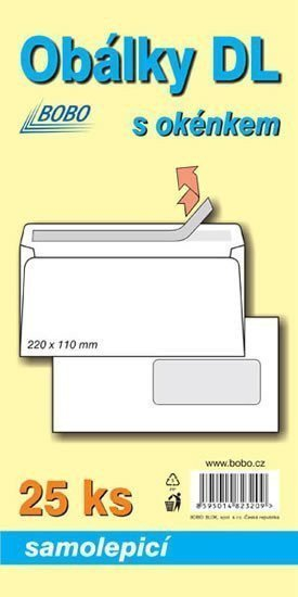 Obálky 220x110 mm, balení 25 ks. Balení klasických poštovních obálek ve formátu DL. Balíček obsahuje 25 kusů samolepicích obálek s okénkem.