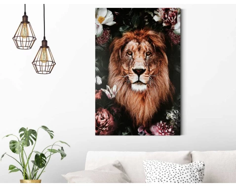 Krásný obraz tištěný na plátně s motivem lva v květinách se stane skutečným poutačem a okamžitě oživí každý interiér. Rozměr 60x80 cm.