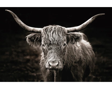 Obraz na plátně 90x60 cm s motivem skotské krávy v monochromatickém provedení se stane nepřehlédnutou dekorací každého interiéru.