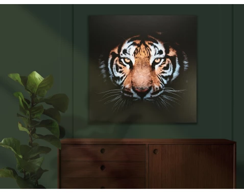Obraz tištěný na plátně s motivem působivého tygra na černém pozadí se stane elegantní dekorací na každé stěně. Rozměr 80x80 cm.