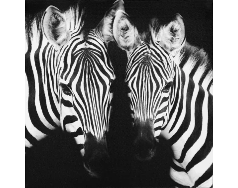 Černobílý obraz tištěný na plátně se zebrami dokonale ozvláštní Váš interiér. Rozměr 50x50 cm.