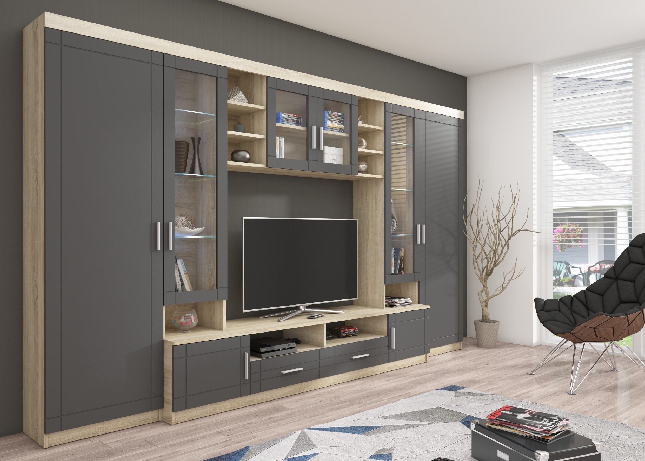 Obývací stěna Paris • Vlastnosti obývací stěny Korpus Na korpus je použita laminová dřevotříska o síle 16 mm. Dveře Dveře jsou vyrobeny z MDF desky o síle 16 mm. Některá dvířka jsou doplněna o čirá skla. Skleněné police Za prosklenými dvířky jsou skleněné police. PVC dýha Hrany desek jsou opatřeny PVC dýhou. Úchyty a nožičky Úchyty a nízké kluzákové nožičky jsou plastové. Počet balení Obývací stěna je rozložena do 8 krabic. • Barevné varianty: Obývací stěna Paris je dostupná ve třech barevných variantách: Dub sonoma, Dub sonoma v kombinaci s bílou barvou nebo Dub sonoma v kombinaci s grafitem. Dub sonoma Bílá Grafit • Rozměry celé sestavy 197,5 cm celková výška 340 cm celková šířka 44 cm celková hloubka 16 mm tloušťka desky • Další součásti obývacího pokojeVybavujete nový byt nebo chcete obměnit svůj stávají nábytek v obývacím pokoji? Sedací souprava, pohovka a konferenční stolky jsou středem dění celé místnosti. V naší nabídce naleznete veškeré tyto komponenty. Zobrazit další nábytek.... •
