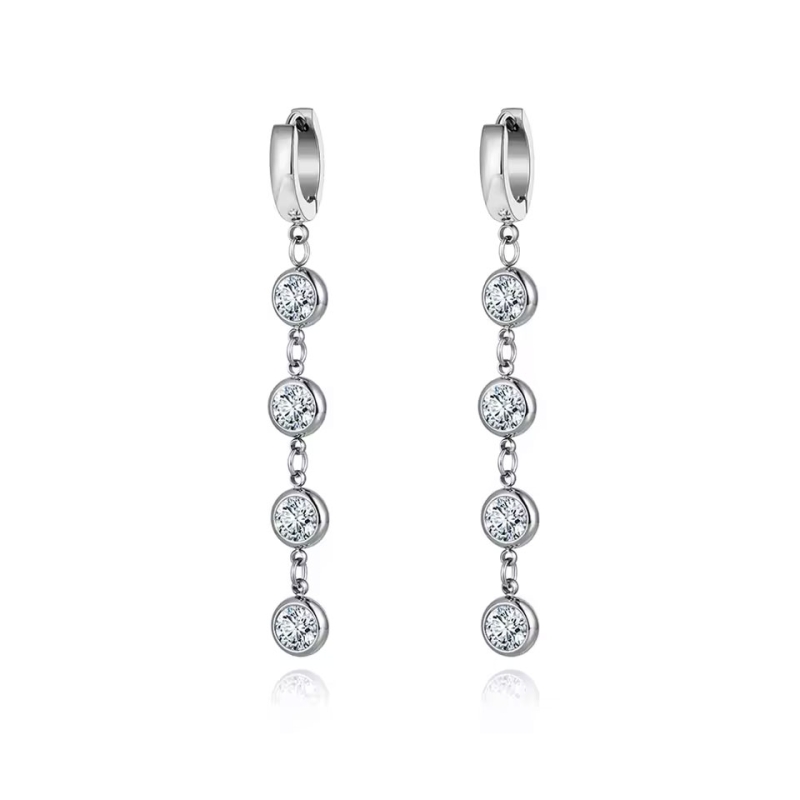 Elegantní visací náušnice z chirurgické oceli se stanou výrazným doplňkem každého outfitu. Precizně zasazené čiré zirkony v kulatých lůžkách vytváří třpytivý efekt, který přitahuje pohledy a podtrhuje vaši přirozenou krásu. Díky jemnému napojení na kroužek působí náušnice vzdušně a současně rafinovaně.Chirurgická ocel zajišťuje nejen vysokou odolnost proti poškrábání a ztrátě lesku, ale i skvělou snášenlivost pro citlivou pokožku. Minimalistické provedení zirkonových kamenů přidává na eleganci, aniž by působilo příliš okázale – hodí se tak jak na každodenní nošení, tak na slavnostní příležitosti.Náušnice jsou navrženy s ohledem na harmonii, lesk a stylovou univerzálnost. Působí jemně, přesto zanechávají výrazný dojem. Jsou ideální volbou pro ženy, které preferují čisté linie a nadčasový design. 💡 Tip: Tyto náušnice skvěle vyniknou v kombinaci s hladkým culíkem nebo vyčesaným drdolem, kdy dají vyniknout svému lesku a délce. Pro zvýraznění elegance doporučujeme sladit s jemným stříbrným náhrdelníkem se zirkony.